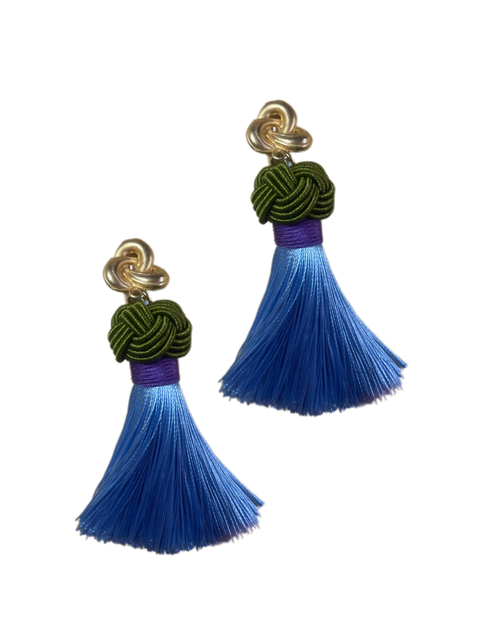 Endlich ist unser ikonischer Nodo Ohrring online! Diese Ohrclips sind unsere eigene Kreation und werden von uns handgefertigt, um höchste Qualität und einzigartiges Design zu gewährleisten. Die dicke Quaste hängt an einem vergoldeten Ohrring, welcher gut am Ohr sitzt, darauf folgt ein handgearbeiteter grüner Nodo gefolgt von einer hellblauen Quaste aus Seide mit lila Detail.