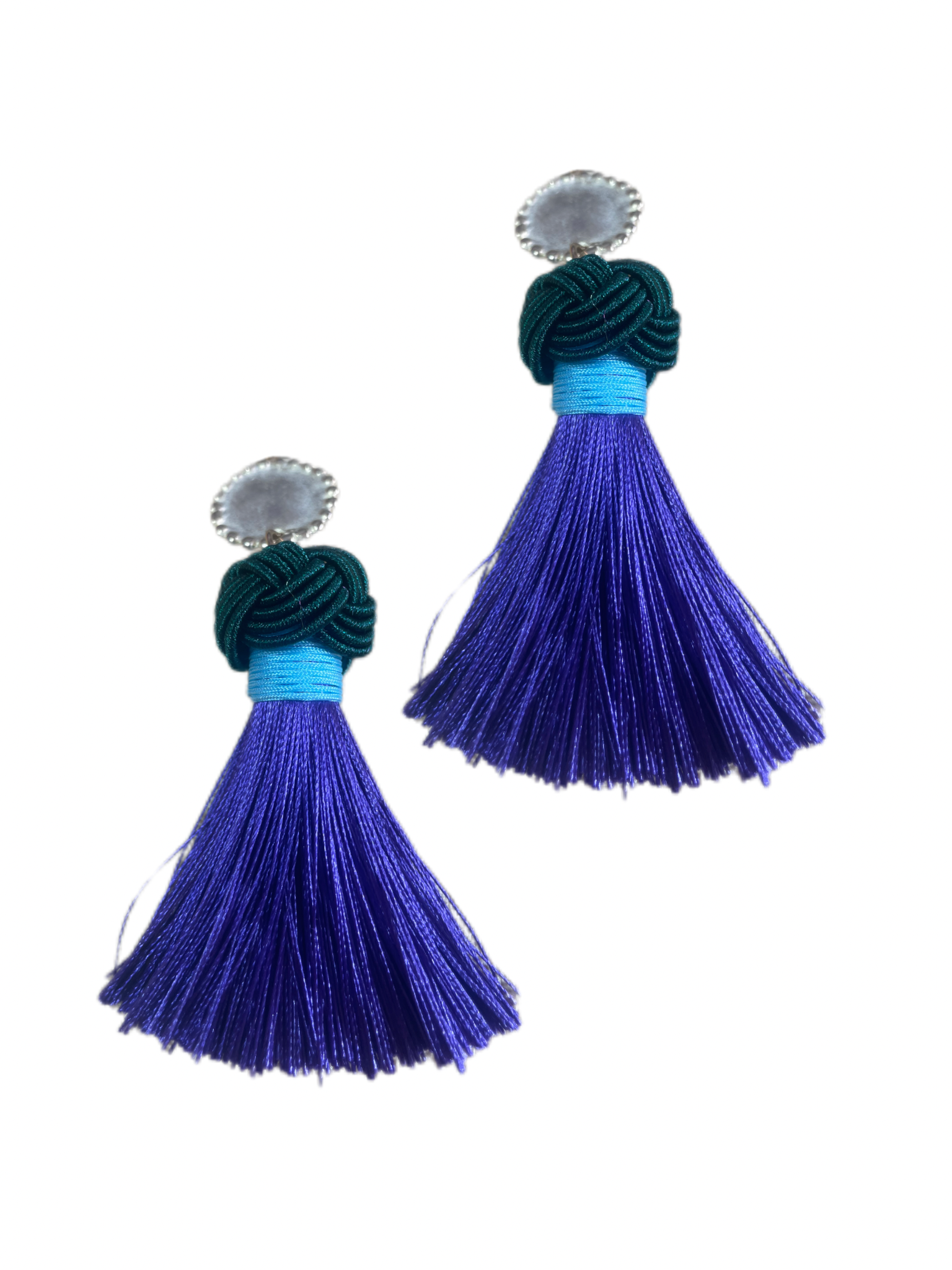 Endlich ist unser ikonischer Nodo Ohrclip online! Diese Ohrclip sind unsere eigene Kreation und werden von uns handgefertigt, um höchste Qualität und einzigartiges Design zu gewährleisten. Die dicke Quaste höngt an einem vergoldeten Ohrclip, welcher gut am Ohr sitzt, darauf folgt ein handgearbeiteter grüner Nodo gefolgt von einer lila Quaste aus Seide mit hellblauem Detail.