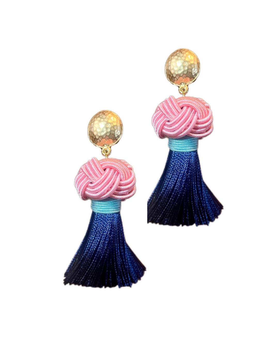 Endlich ist unser ikonischer Nodo Ohrring online! Diese Ohrclips sind unsere eigene Kreation und werden von uns handgefertigt, um höchste Qualität und einzigartiges Design zu gewährleisten. Die dicke Quaste hängt an einem vergoldeten Ohrring, welcher gut am Ohr sitzt, darauf folgt ein handgearbeiteter Nodo in hell rosa gefolgt von einer dunkel blauen Quaste aus Seide mit Olive hellblauen Detail.