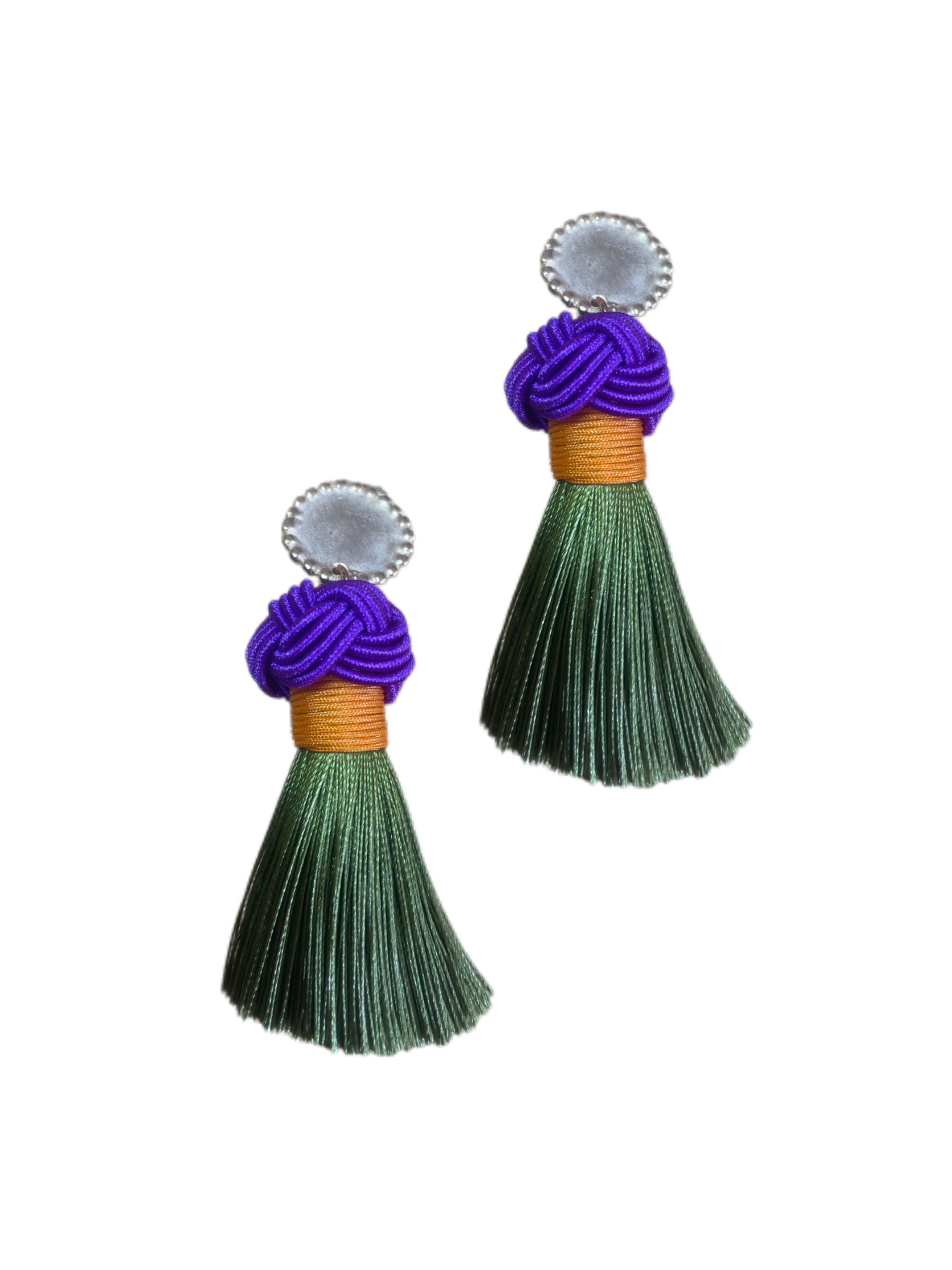 Endlich ist unser ikonischer Nodo Ohrclip online! Diese Ohrclips sind unsere eigene Kreation und werden von uns handgefertigt, um höchste Qualität und einzigartiges Design zu gewährleisten. Die dicke Quaste hängt an einem vergoldeten Ohrclip, welcher gut am Ohr sitzt, darauf folgt ein handgearbeiteter lila Nodo gefolgt von einer grünen Quaste aus Seide mit neon orange Detail.