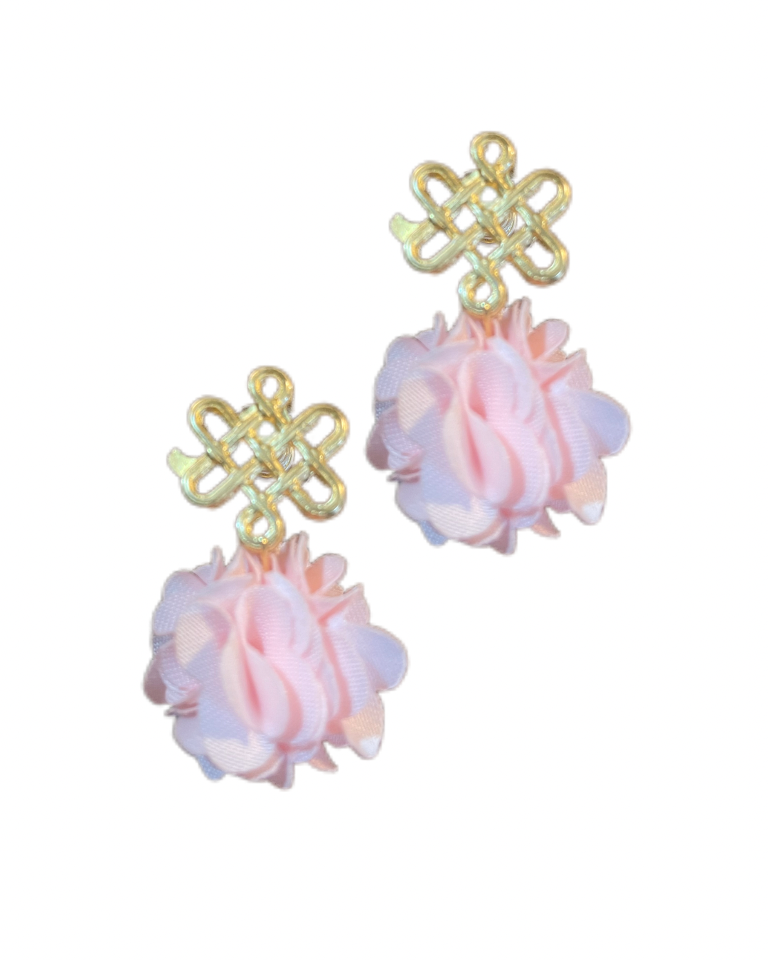 Entdecken Sie zeitlose Eleganz mit unseren 'Glücksknoten & Fleur Blumen Pompom Ohrringen. Jeder Ohrring präsentiert stolz einen goldenen Glücksknoten, woran eine leichte Kreation aus Blütenblättern hängt. Ihr Unikat für einen Hauch von Luxus im Alltag. Der Ohrring ist federleicht und sitzt mittig am Ohr