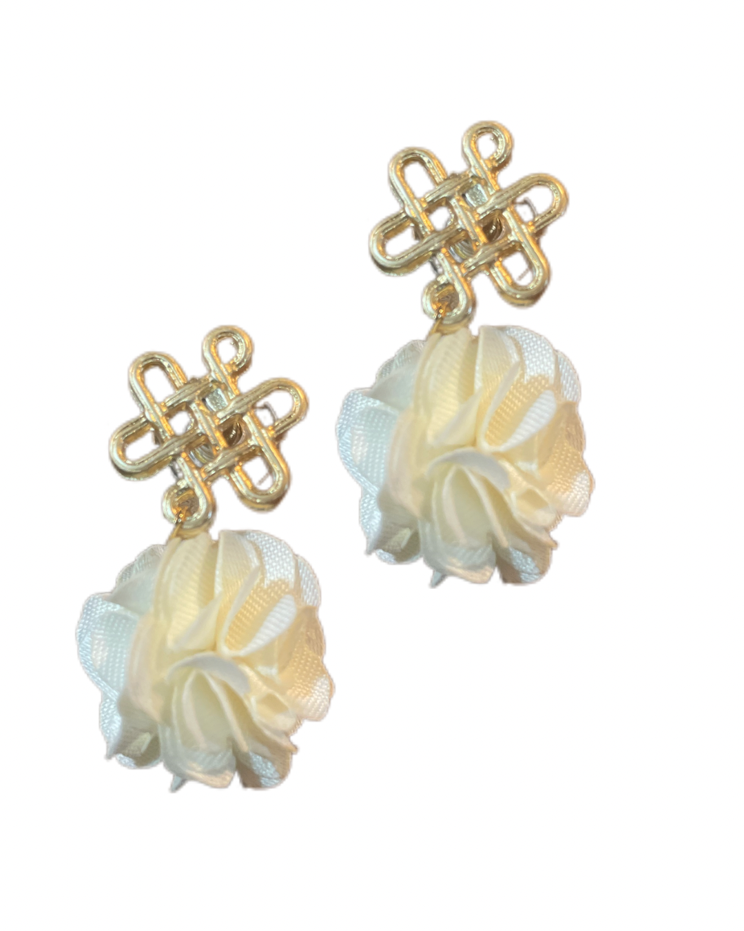 Entdecken Sie zeitlose Eleganz mit unseren 'Glücksknoten & Fleur Blumen Pompom Ohrringen. Jeder Ohrring präsentiert stolz einen goldenen Glücksknoten, woran eine leichte Kreation aus Blütenblättern hängt. Ihr Unikat für einen Hauch von Luxus im Alltag. Der Ohrring ist federleicht und sitzt mittig am Ohr