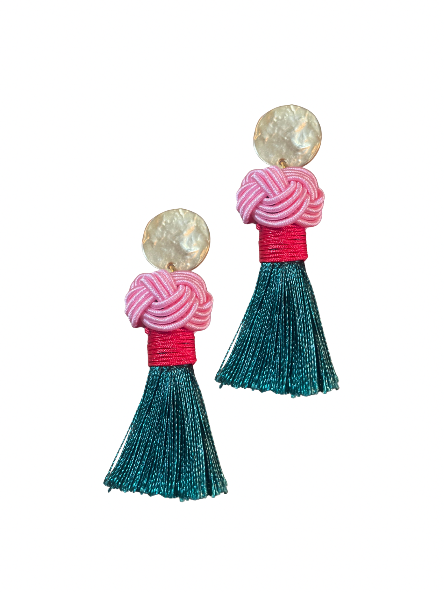 Endlich ist unser ikonischer Nodo Ohrring online! Diese Ohrringe sind unsere eigene Kreation und werden von uns handgefertigt, um höchste Qualität und einzigartiges Design zu gewährleisten. Die dicke Quaste hängt an einem vergoldeten Ohrring, welcher gut am Ohr sitzt, darauf folgt ein handgearbeiteter rosa Nodo gefolgt von einer grünen Quaste aus Seide mit pinken Detail.