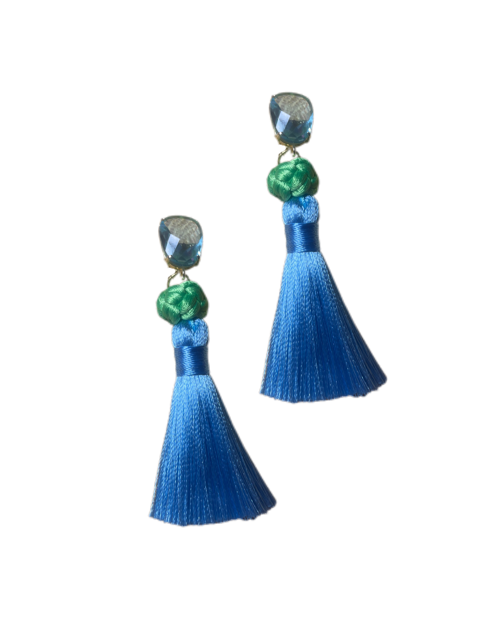 Endlich ist unser ikonischer Nodo Ohrring online! Diese Ohrringe sind unsere eigene Kreation und werden von uns handgefertigt, um höchste Qualität und einzigartiges Design zu gewährleisten. Der Ohrring hängt an einem vergoldeten hell blauem Kristall Top, welches gut am Ohr sitzt, darauf folgt ein handgearbeiteter hellgrüner Nodo gefolgt von einer türkiser Quaste aus Seide.