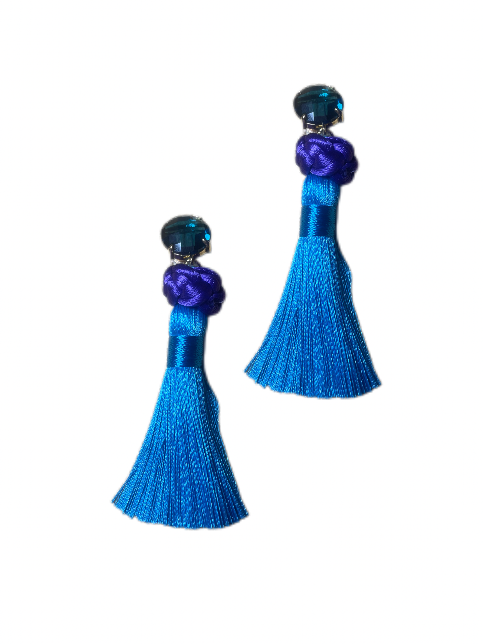 Endlich ist unser ikonischer Nodo Ohrring online! Diese Ohrringe sind unsere eigene Kreation und werden von uns handgefertigt, um höchste Qualität und einzigartiges Design zu gewährleisten. Der Ohrring hängt an einem vergoldeten petrol Kristall Top, welches gut am Ohr sitzt, darauf folgt ein handgearbeiteter lila Nodo gefolgt von einer türkisen Quaste aus Seide.