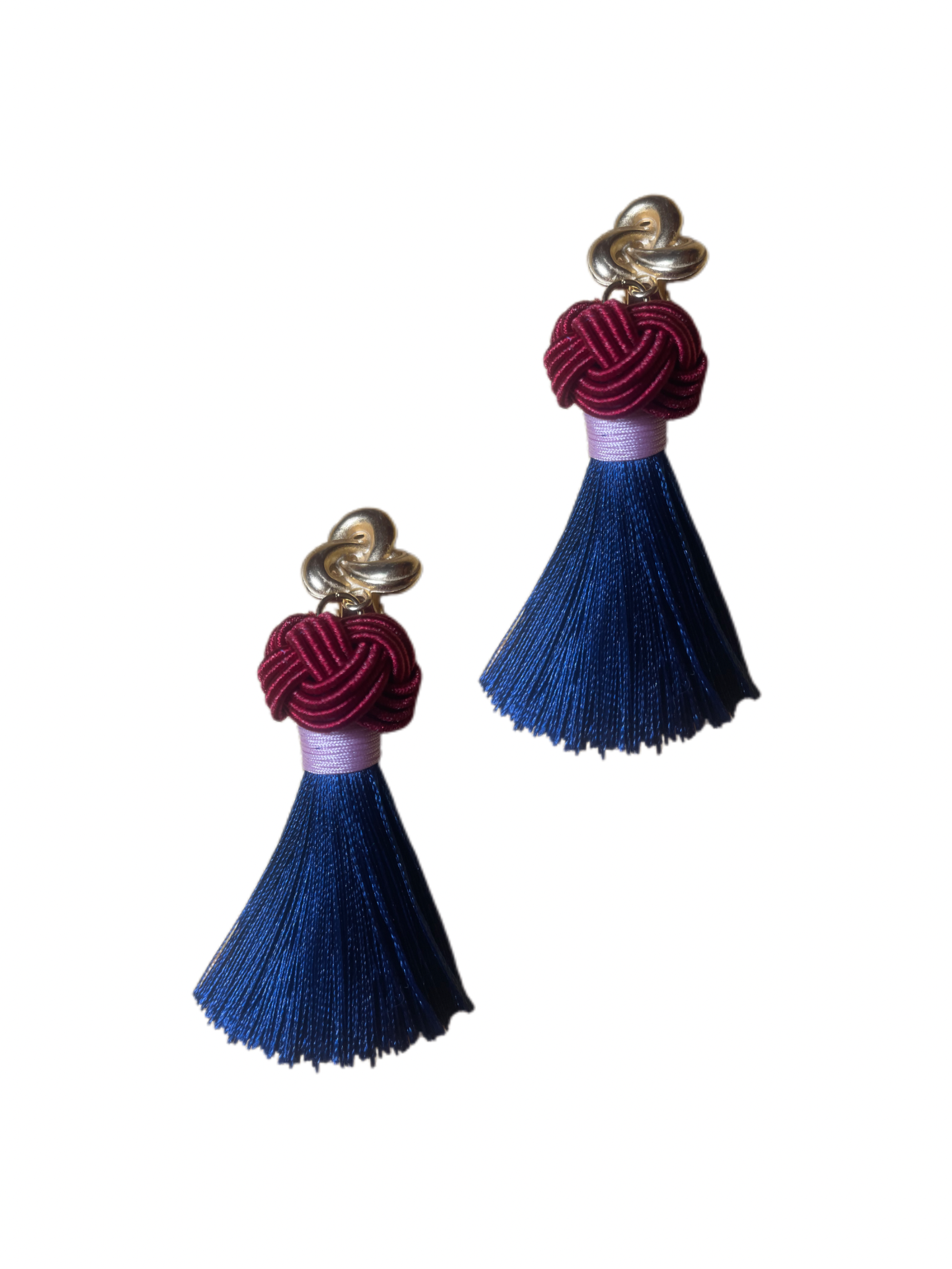 Endlich ist unser ikonischer Nodo Ohrring online! Diese Ohrringe sind unsere eigene Kreation und werden von uns handgefertigt, um höchste Qualität und einzigartiges Design zu gewährleisten. Die dicke Quaste hängt an einem Perlencabouchon Ohrring, welcher gut am Ohr sitzt, darauf folgt ein handgearbeiteter blauer Nodo gefolgt von einer pinken Quaste aus Seide mit hellblauen Detail.