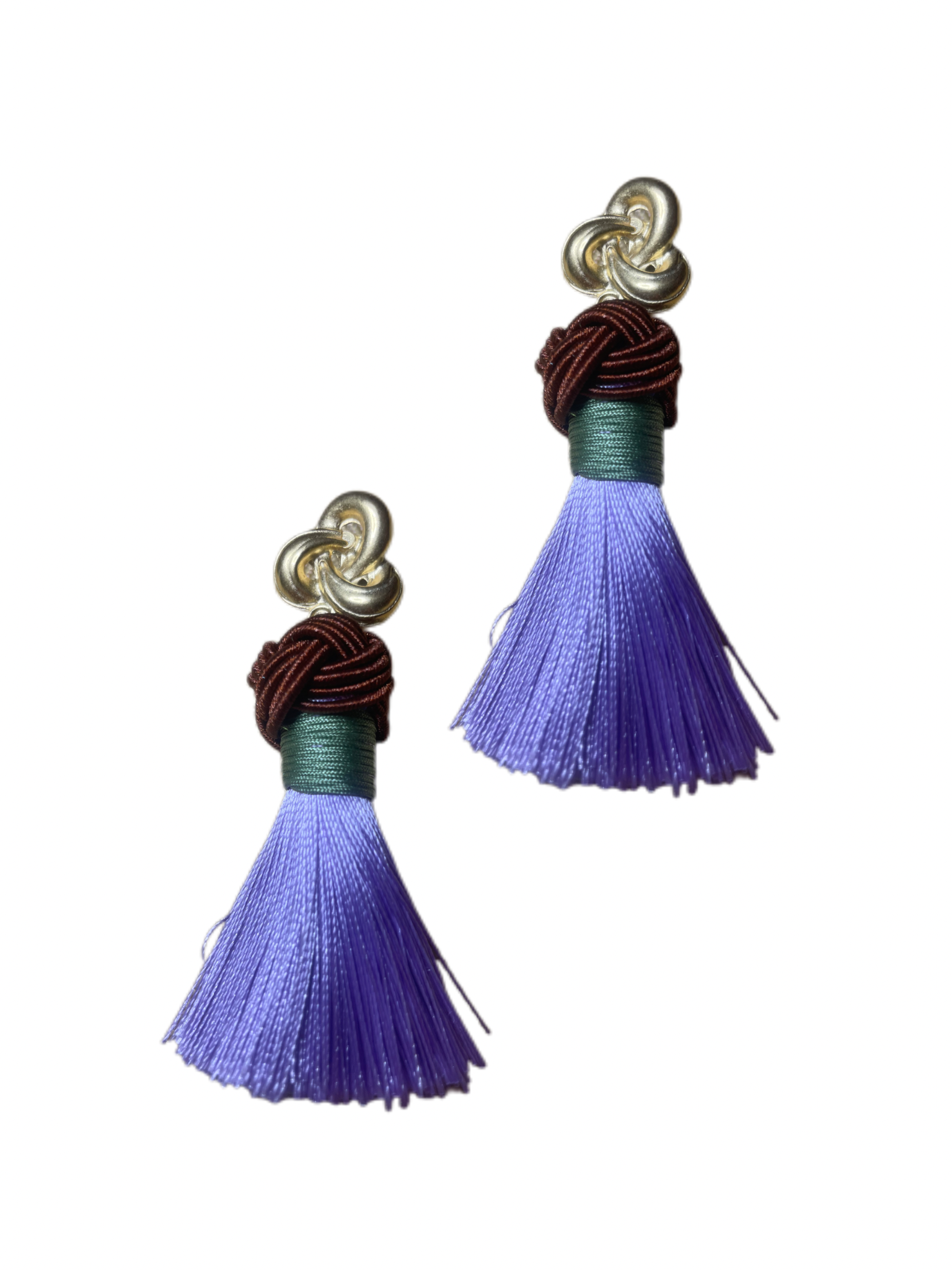 Endlich ist unser ikonischer Nodo Ohrring online! Diese Ohrringe sind unsere eigene Kreation und werden von uns handgefertigt, um höchste Qualität und einzigartiges Design zu gewährleisten. Die dicke Quaste hängt an einem vergoldeten Ohrring, welcher gut am Ohr sitzt, darauf folgt ein handgearbeiteter brauner Nodo gefolgt von einer beiten Quaste aus lila Seide mit grünem Detail.