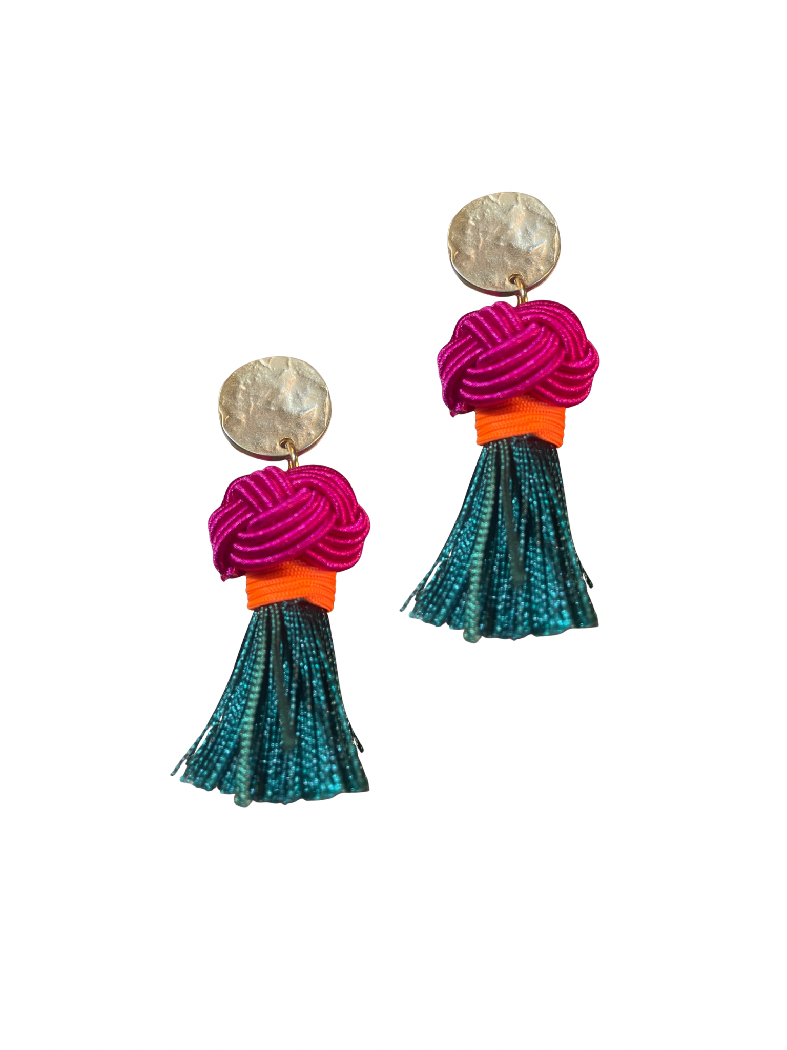 Endlich ist unser ikonischer Nodo Ohrring online! Diese Ohrringe sind unsere eigene Kreation und werden von uns handgefertigt, um höchste Qualität und einzigartiges Design zu gewährleisten. Die dicke Quaste hängt an einem vergoldeten Ohrring, welcher gut am Ohr sitzt, darauf folgt ein handgearbeiteter pinker Nodo gefolgt von einer dunkel grünen Quaste aus Seide mit Olive neon orangen Detail.