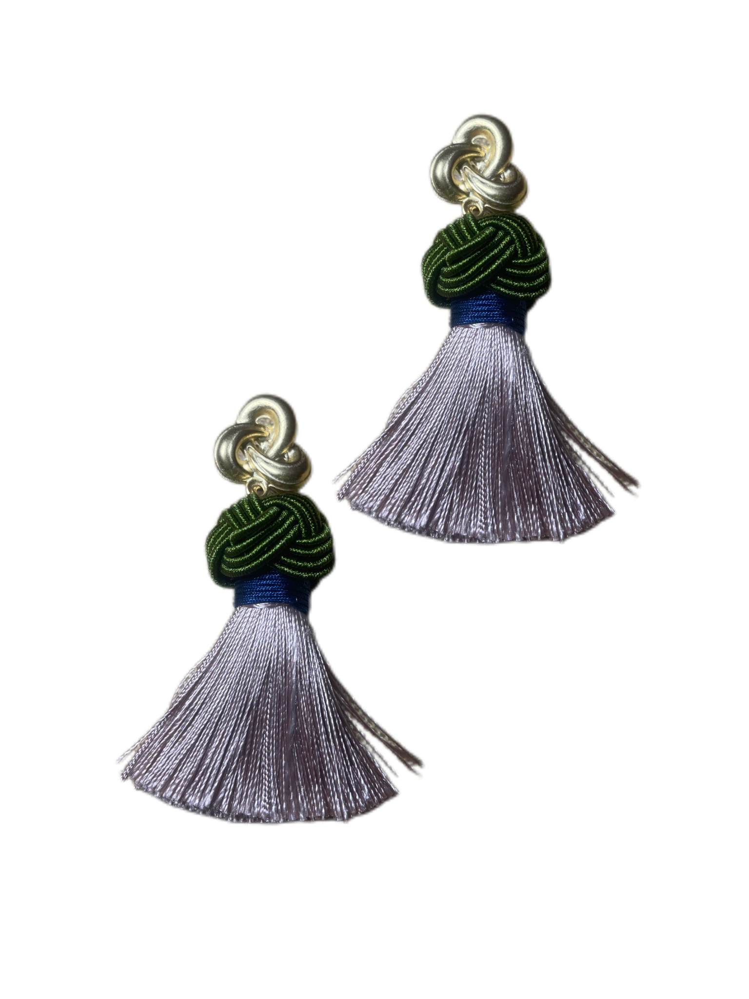 Endlich ist unser ikonischer Nodo Ohrring online! Diese Ohrringe sind unsere eigene Kreation und werden von uns handgefertigt, um höchste Qualität und einzigartiges Design zu gewährleisten. Die dicke Quaste hängt an einem vergoldeten Ohrring, welcher gut am Ohr sitzt, darauf folgt ein handgearbeiteter grüner Nodo gefolgt von einer beiger Quaste aus Seide mit blauem Detail.