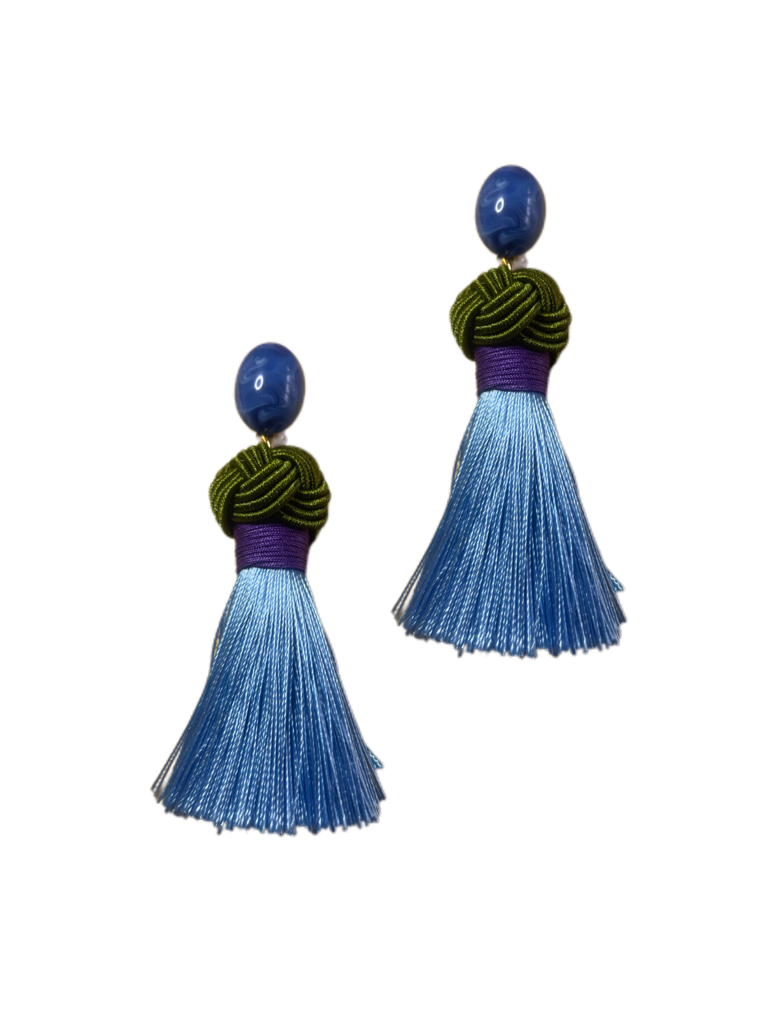 Endlich ist unser ikonischer Nodo Ohrring online! Diese Ohrringe sind unsere eigene Kreation und werden von uns handgefertigt, um höchste Qualität und einzigartiges Design zu gewährleisten. Die dicke Quaste hängt an einem Perlencabouchon Ohrring, welcher gut am Ohr sitzt, darauf folgt ein handgearbeiteter grüner Nodo gefolgt von einer hellblauen Quaste aus Seide mit lila Detail.