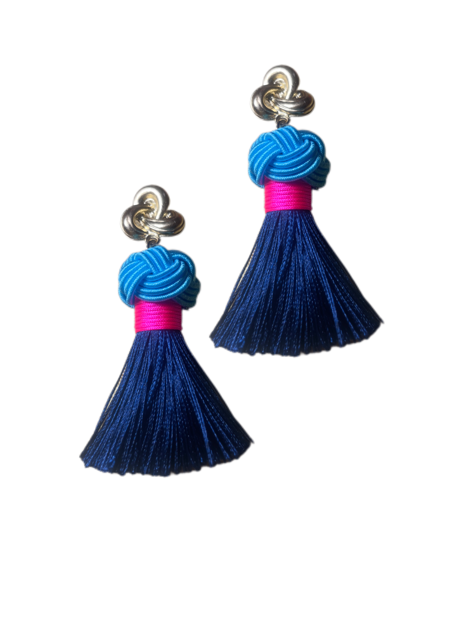 Endlich ist unser ikonischer Nodo Ohrring online! Diese Ohrclips sind unsere eigene Kreation und werden von uns handgefertigt, um höchste Qualität und einzigartiges Design zu gewährleisten. Die dicke Quaste hängt an einem vergoldeten Ohrring, welcher gut am Ohr sitzt, darauf folgt ein handgearbeiteter hellblauer Nodo gefolgt von einer dunkel blauer Quaste aus Seide mit Olive neon pinken Detail.