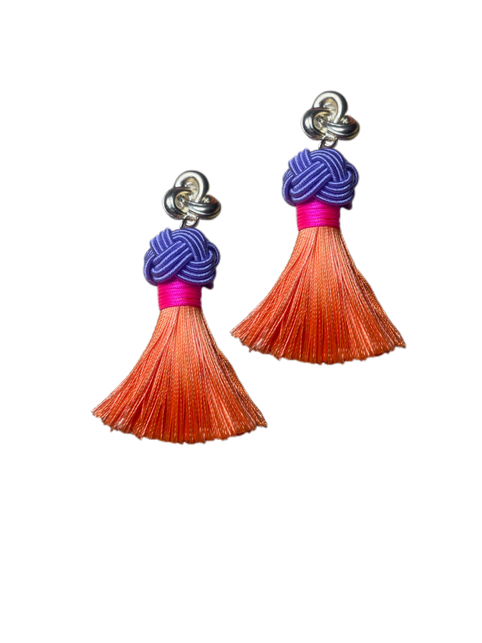 Endlich ist unser ikonischer Nodo Ohrring online! Diese Ohrringe sind unsere eigene Kreation und werden von uns handgefertigt, um höchste Qualität und einzigartiges Design zu gewährleisten. Die dicke Quaste hängt an einem vergoldeten Ohrring, welcher gut am Ohr sitzt, darauf folgt ein handgearbeiteter Nodo in hell lila gefolgt von einer orangenen Quaste aus Seide mit Olive neon pinken Detail.