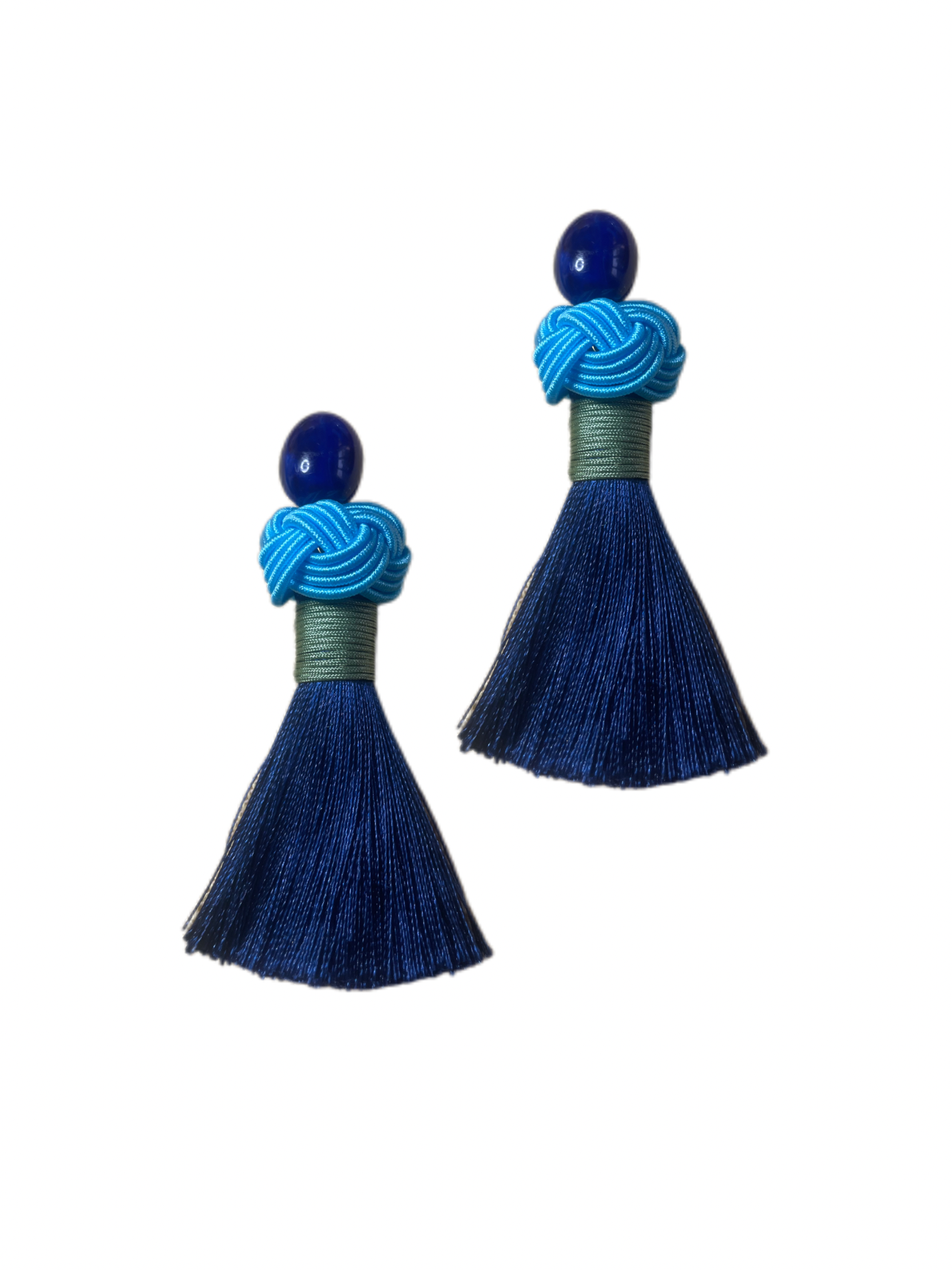 Endlich ist unser ikonischer Nodo Ohrring online! Diese Ohrringe sind unsere eigene Kreation und werden von uns handgefertigt, um höchste Qualität und einzigartiges Design zu gewährleisten. Die dicke Quaste hängt an einem Perlencabouchon Ohrring, welcher gut am Ohr sitzt, darauf folgt ein handgearbeiteter hellblauer Nodo gefolgt von einer blauen Quaste aus Seide mit grünem Detail.
