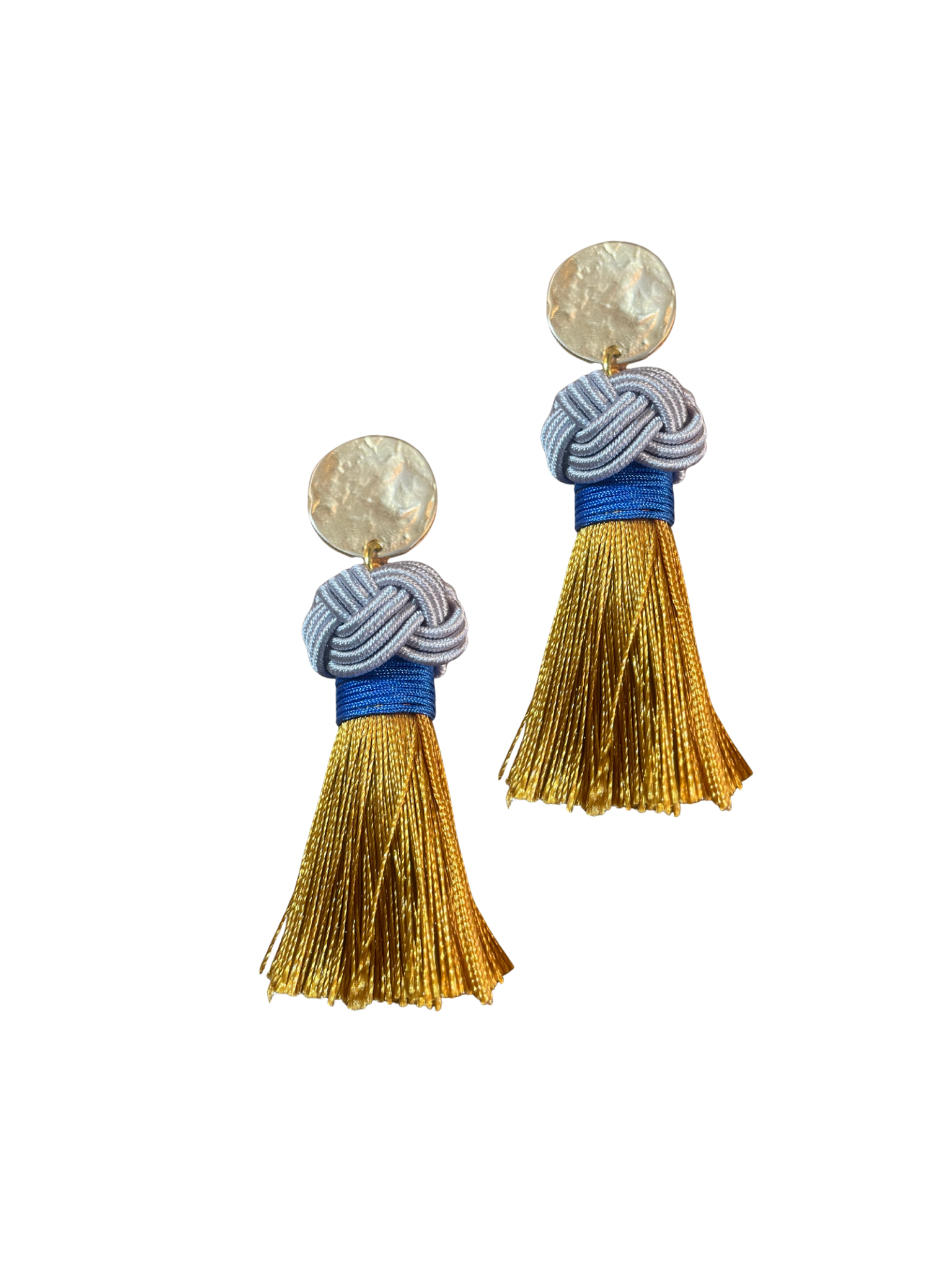 Endlich ist unser ikonischer Nodo Ohrring online! Diese Ohrringe sind unsere eigene Kreation und werden von uns handgefertigt, um höchste Qualität und einzigartiges Design zu gewährleisten. Die dicke Quaste hängt an einem vergoldeten Ohrring, welcher gut am Ohr sitzt, darauf folgt ein handgearbeiteter grauer Nodo gefolgt von einer goldenen Quaste aus Seide mit Olive blauem Detail.
