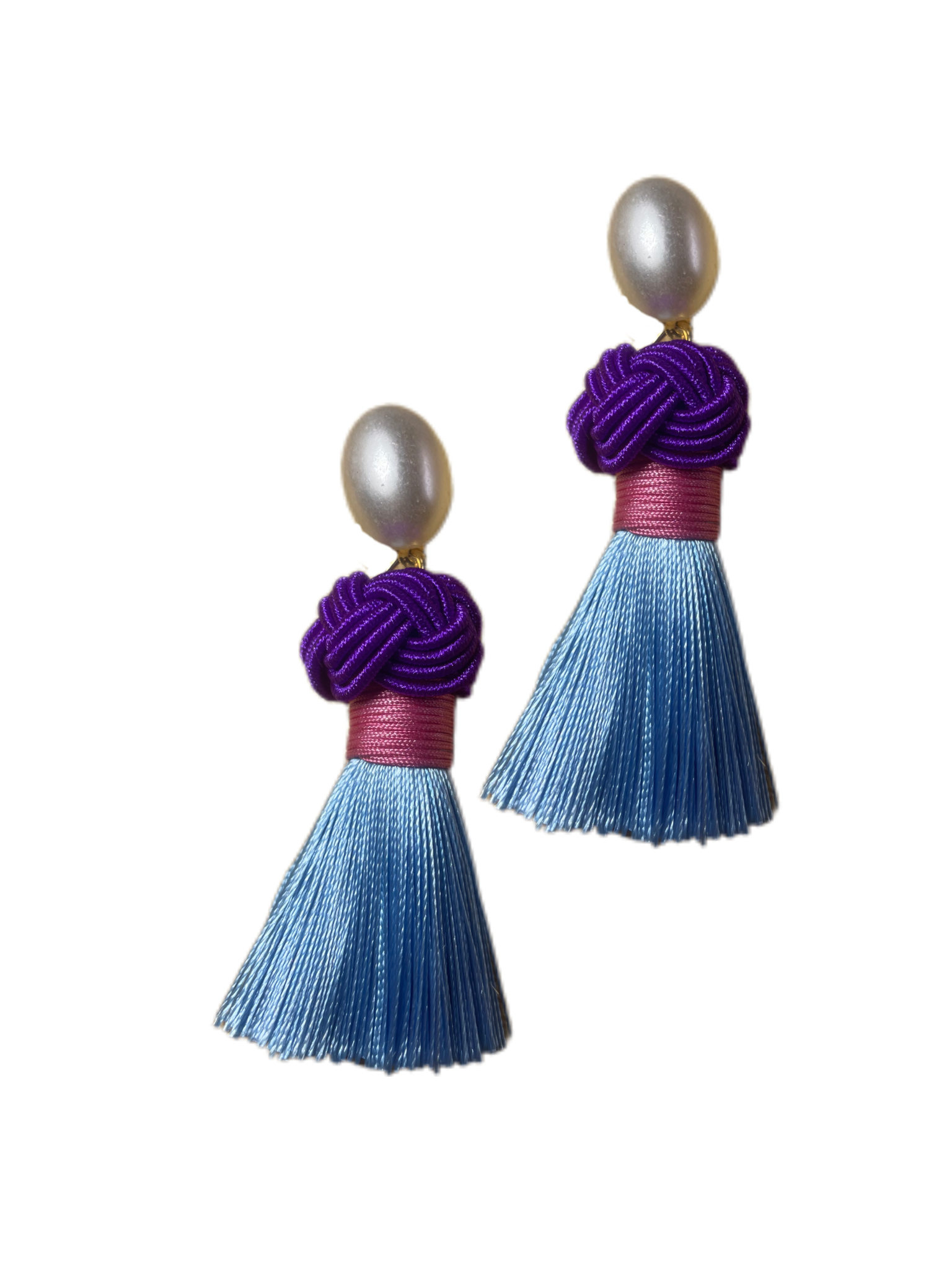 Endlich ist unser ikonischer Nodo Ohrring online! Diese Ohrringe sind unsere eigene Kreation und werden von uns handgefertigt, um höchste Qualität und einzigartiges Design zu gewährleisten. Die dicke Quaste hängt an einem Perlencabouchon Ohrring, welcher gut am Ohr sitzt, darauf folgt ein handgearbeiteter lila Nodo gefolgt von einer hellblauen Quaste aus Seide mit pinkem Detail.