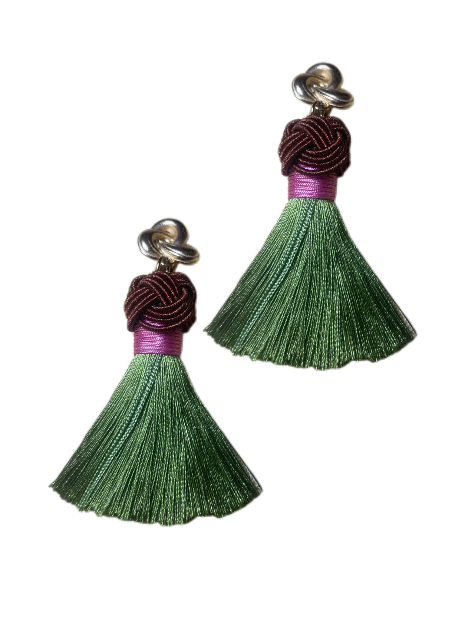Endlich ist unser ikonischer Nodo Ohrring online! Diese Ohrringe sind unsere eigene Kreation und werden von uns handgefertigt, um höchste Qualität und einzigartiges Design zu gewährleisten. Die dicke Quaste hängt an einem vergoldeten Ohrring, welcher gut am Ohr sitzt, darauf folgt ein handgearbeiteter brauner Nodo gefolgt von einer olive grüner Quaste aus Seide mit rosanen Detail.