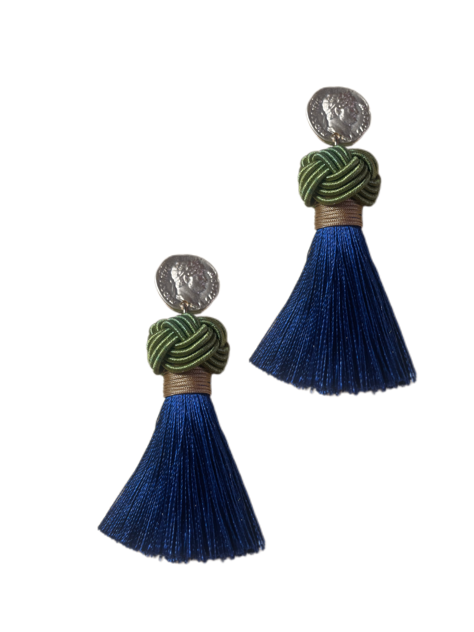 Endlich ist unser ikonischer Nodo Ohrring online! Diese Ohrringe sind unsere eigene Kreation und werden von uns handgefertigt, um höchste Qualität und einzigartiges Design zu gewährleisten. Die dicke Quaste höngt an einem vergoldeten Ohrring, welcher gut am Ohr sitzt, darauf folgt ein handgearbeiteter Olive grüner Nodo gefolgt von einer dunkel blauer Quaste aus Seide mit Olive grünem Detail.