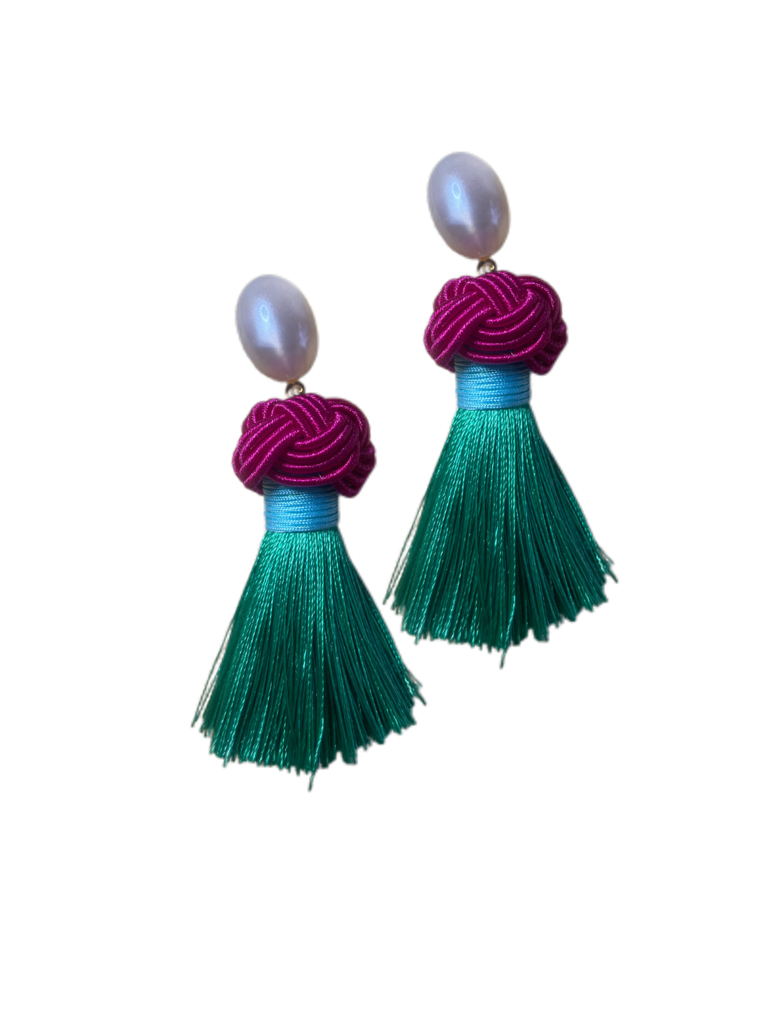Endlich ist unser ikonischer Nodo Ohrring online! Diese Ohrringe sind unsere eigene Kreation und werden von uns handgefertigt, um höchste Qualität und einzigartiges Design zu gewährleisten. Die dicke Quaste hängt an einem Perlencabouchon Ohrring, welcher gut am Ohr sitzt, darauf folgt ein handgearbeiteter pinker Nodo gefolgt von einer grünen Quaste aus Seide mit hellblauen Detail.