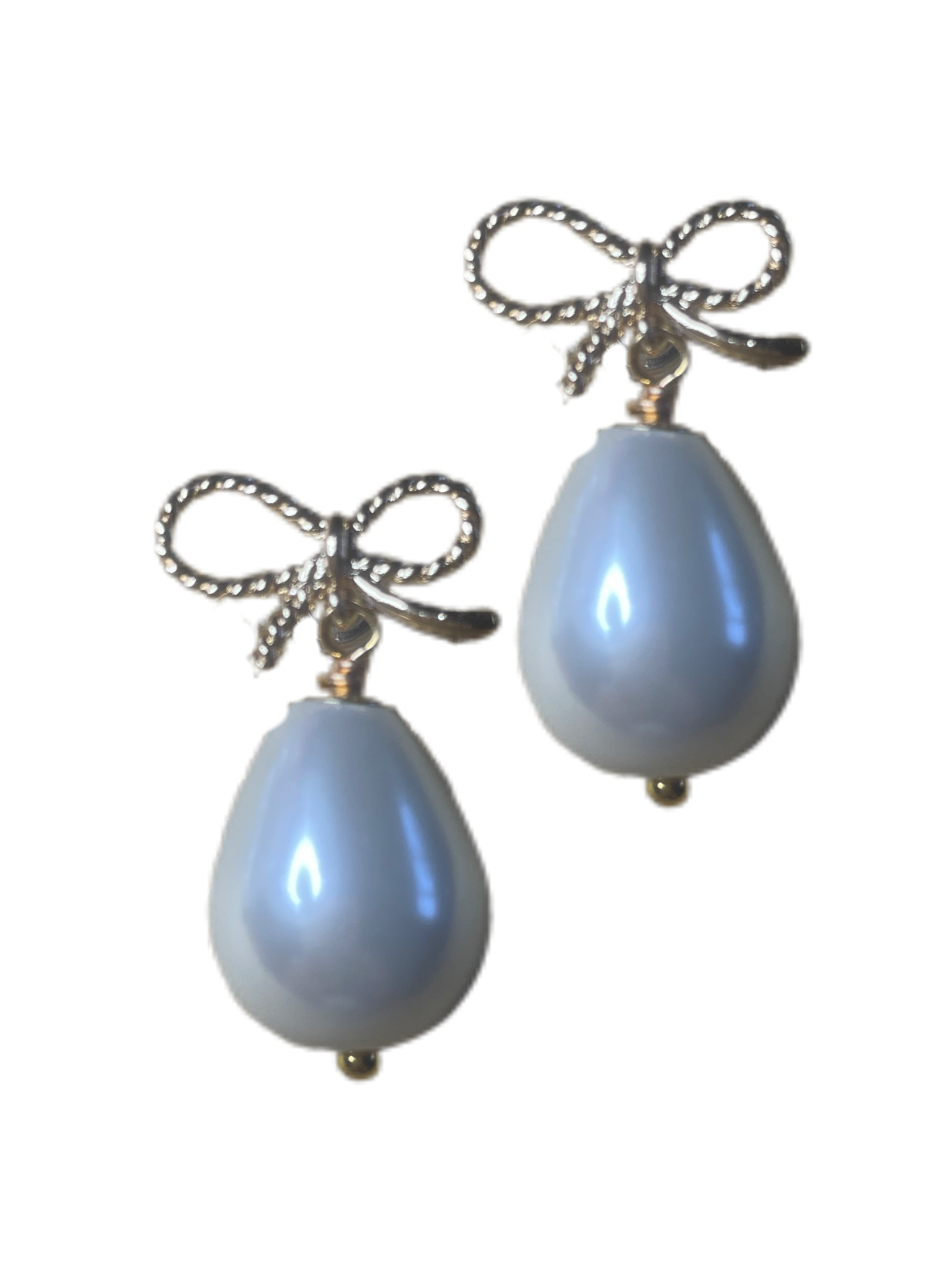 Entdecken zeitlose Eleganz mit unseren vergoldeten Schleifen Ohrringen & Perlentropfen'-Ohrringen. Jeder Ohrring präsentiert stolz eine vergoldeten Schleife an der eine einzigartige, per Hand ausgewählten Perle hängt. Bitte beachten Sie, dass jede Perle bei Bestellung leicht variieren kann. Ihr Unikat für einen Hauch von Luxus im Alltag.