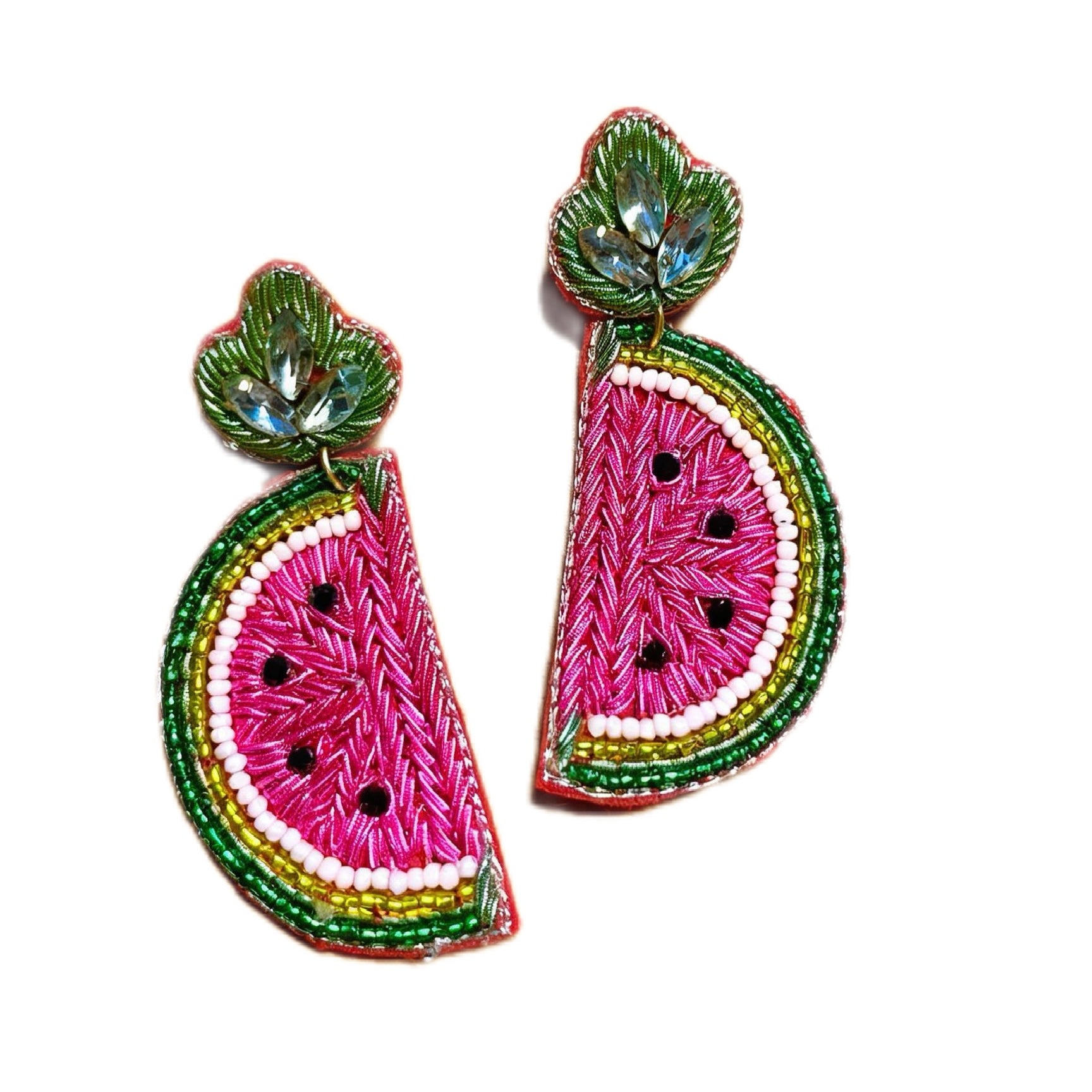 Machen Sie sich bereit für den Sommer – mit unseren Wassermelone Ohrringen. Diese aufwendig gearbeiteten Ohrringe sind mit Metallfäden bestickt und mit kleinen Strasssteinen verziert. Ob am Strand oder in der Stadt – dieser Ohrring bringt Urlaubsstimmung direkt zu Ihnen nach Hause.